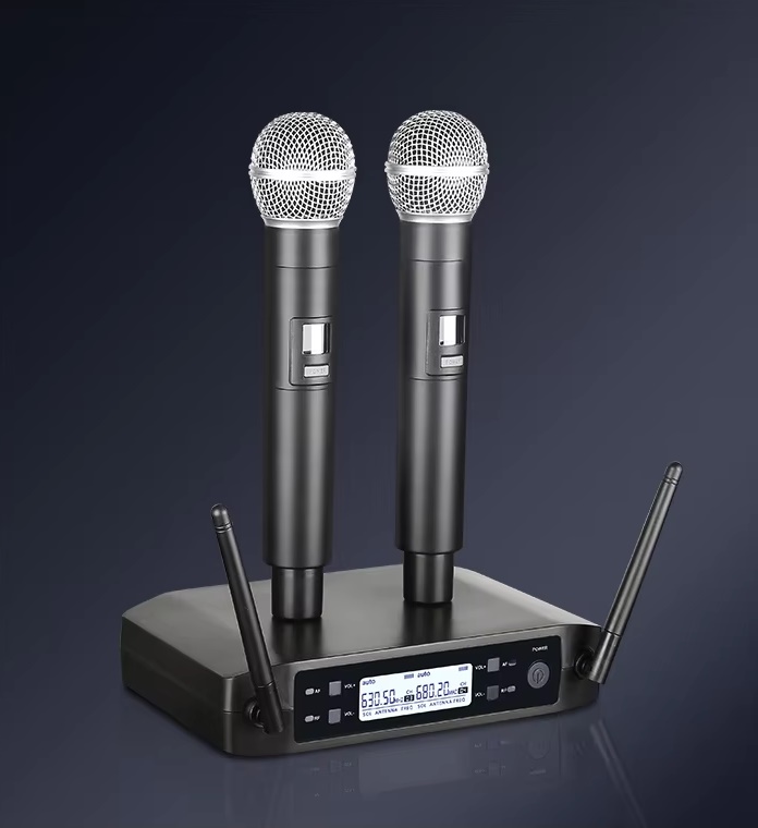 Alle vrijheid met de First Class draadloze microfoonset met twee UHF handmicrofoons