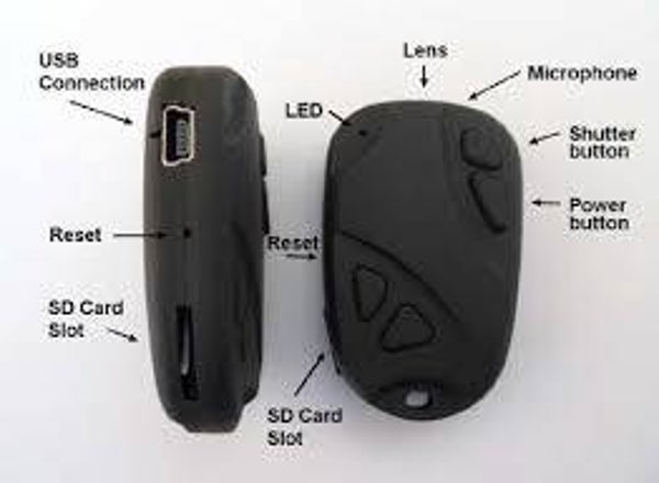 De autosleutel is niet van echt te onderscheiden, maar bevat in werkelijkheid een cameralens en een flip key waaronder zich een USB aansluiting bevindt.